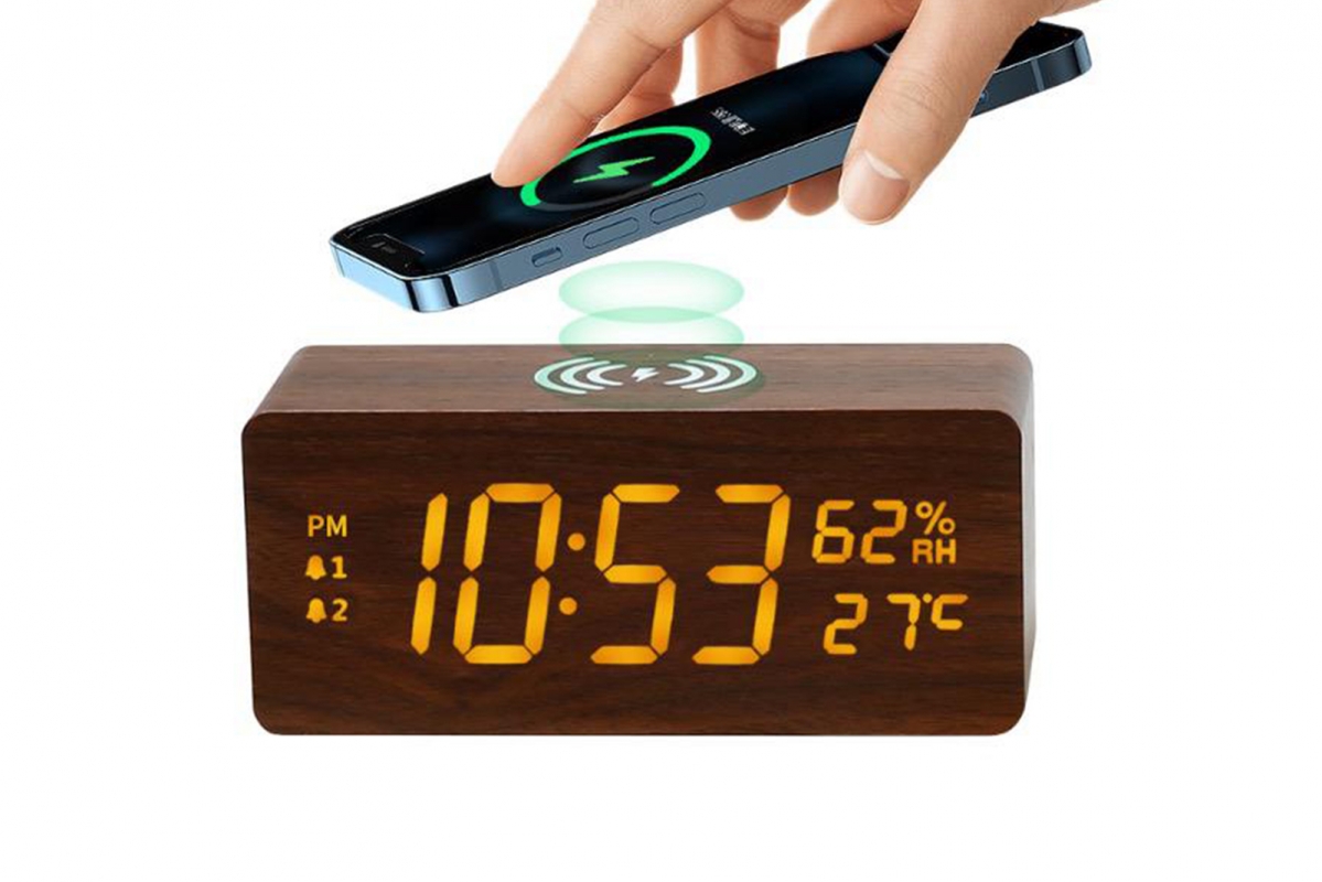 - Multifunkční dřevěná bezdrátová nabíječka, budík a LED hodiny