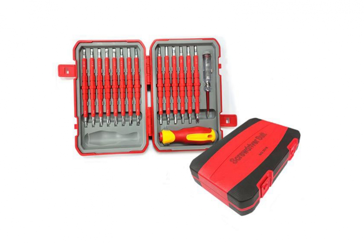 Izolovaná šroubováková sada 29v1 – spolehlivý nástroj pro práci s elektroinstalací. V červeno-žlutém provedení, vyrobena z odolných materiálů TPR, PP a Cr-V oceli. Ergonomická rukojeť o délce 205 mm zajišťuje pohodlný úchop i při delší práci. Celková hmotnost sady je 1000 g. Obsahuje 29 různých nástavců pro široké spektrum použití, vhodné pro elektrikáře i domácí kutily. Díky izolaci je práce s elektrickými zařízeními bezpečnější. Praktické a odolné balení pro snadné přenášení i skladování.
