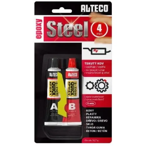 Jedná se o takzvaný tekutý kov pro nejnáročnější opravy, lepení a lepící svařování za studena. Toto dvousložkové velmi pevné epoxidové lepidlo umožňuje lepit a opravovat i ty nejnáročnějí spoje s vysokou smykovou pevností min. 130 kg/cm2. Tepelná odolnost je po vytvrzení -20°C až +120°C. VLASTNOSTI: je šedé barvy obsahuje ocelový prášek má vyplňovací schopnosti je tepelně vodivé není elektricky vodivé vytvrzuje 24 hodin ROZSAH POUŽITÍ: Je vhodné pro lepení kovů, dřeva, dřevotřísky, tvrdých plastů, laminátů, keramiky, porcelánu, skla, betonu, kamene, gumy, pěnového polystyrenu aj. a to jak mezi sebou, tak i navzájem. Není vhodné pro lepení PP, PE, teflonu a silikonu. NÁVOD K POUŽITÍ: Lepené části musí být čisté, suché a odmaštěné. Vytlačte plnidlo a tvrdidlo v objemovém poměru 1 : 1 (dva stejné proužky) a řádně promíchejte. Zpracovatelnost lepidla jsou 4 minuty při pokojové teplotě. Lepidlo naneste jednostranně, u drsných a porézních materiálů oboustranně, oba povrchy přitlačte k sobě a zafixujte (pomocí svorek nebo pásky). Konce tub řádně očistěte a uzavřete. Konečná funkční pevnost po 24 hodinách. Minimální pracovní teplota je 15°C. Skladujte v suchu a chladu. TECHNICKÁ DATA: Vzhled: šedá pasta Viskozita (cP/25°C): 106 Specifická hmotnost (25°C/4°C): (A) 1,7; (B) 1,5 Smyková pevnost v tahu (kg/cm2): min. 130 Zpracovatelnost (min.): 4 Manipulační pevnost (min.): 20 Funkční pevnost (hod): 8 Tvrdost (Shore-D): 80 Míchací poměr: 1 : 1 objemově Tepelná odolnost (°C): -20°C do +120°C