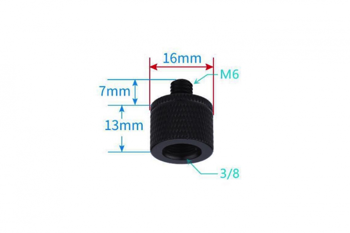 Adaptér šroub 3/8" samice na M6 samec v černé barvě. Vyroben z lehké a odolné hliníkové slitiny. Hmotnost 5,5 g. Vhodný pro připojení různého fotografického a technického příslušenství. Cena za jeden kus.