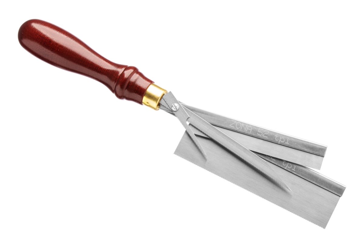 Sada obsahující tlustší hruškovitou dřevěnou rukojeť a čtyři výměnné pilové listy ZONA: 36-050 ultratenká 52zubů/palec 114x11,1mm, 36-555 tenká široká 39,7x30,1mm, 32zubů/palec, 36-458 dlouhá děrovka 114mm, 24zubů/palec a 36-408 tenká děrovka o délce 57mm, 24zubů/palec. Náhradní listy se prodávají zvlášť.