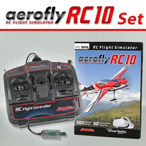 Simulátor aeroflyRC10 je program na DVD pro PC se 64bitovými operačními systémemy Windows 8.1/10/11; je doplněn o 7kanálový proporcionální RC ovladač připojovaný do USB portu počítače..