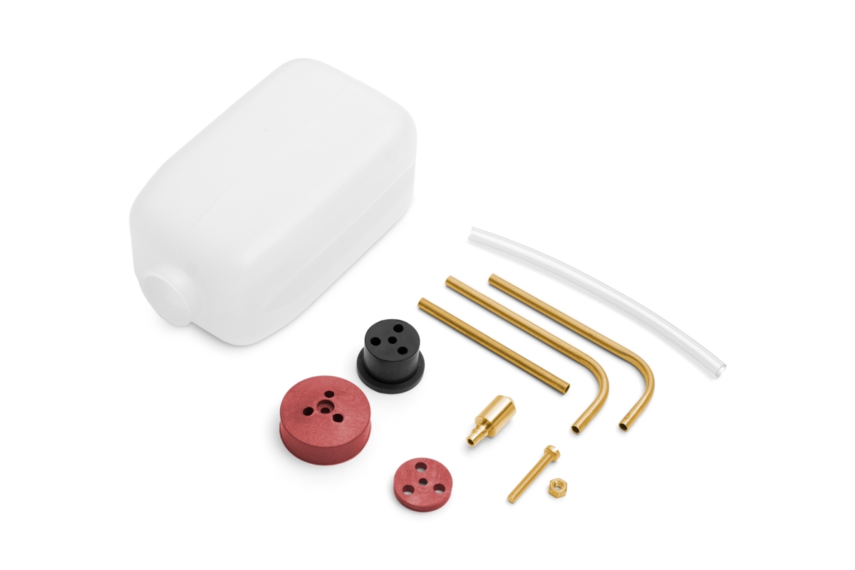 Lehká ale pevná nylonová nádrž 170 ml pro žhavící palivo s odolným víčkem, gumovou zátkou a opěrnou deskou. Předohýbané mosazné fitinky a sací závaží, silikonová hadička. Rozměry (bez hrdla a víčka): 91x54x43 mm, hmotnost: 36g.