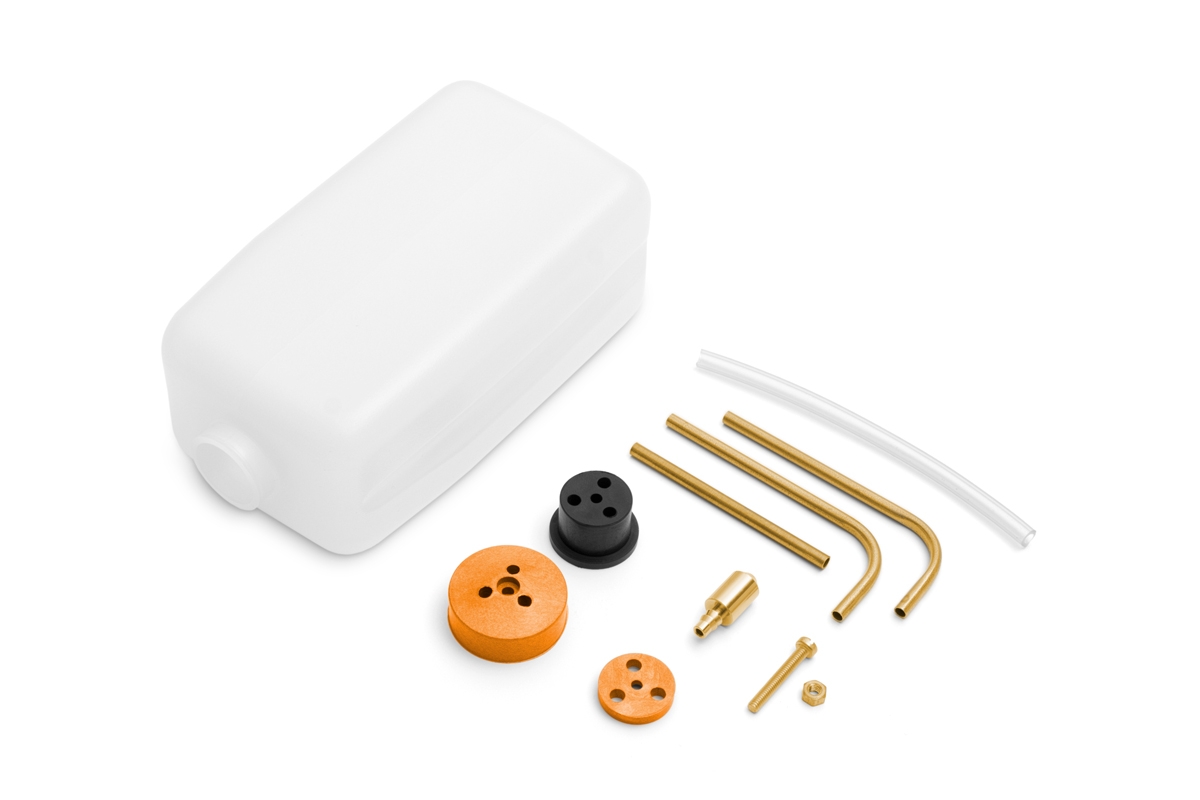 Lehká ale pevná nylonová nádrž 284 ml pro žhavící palivo s odolným víčkem, gumovou zátkou a opěrnou deskou. Předohýbané mosazné fitinky a sací závaží, silikonová hadička. Rozměry (bez hrdla a víčka): 110x60x48 mm, hmotnost: 46g.