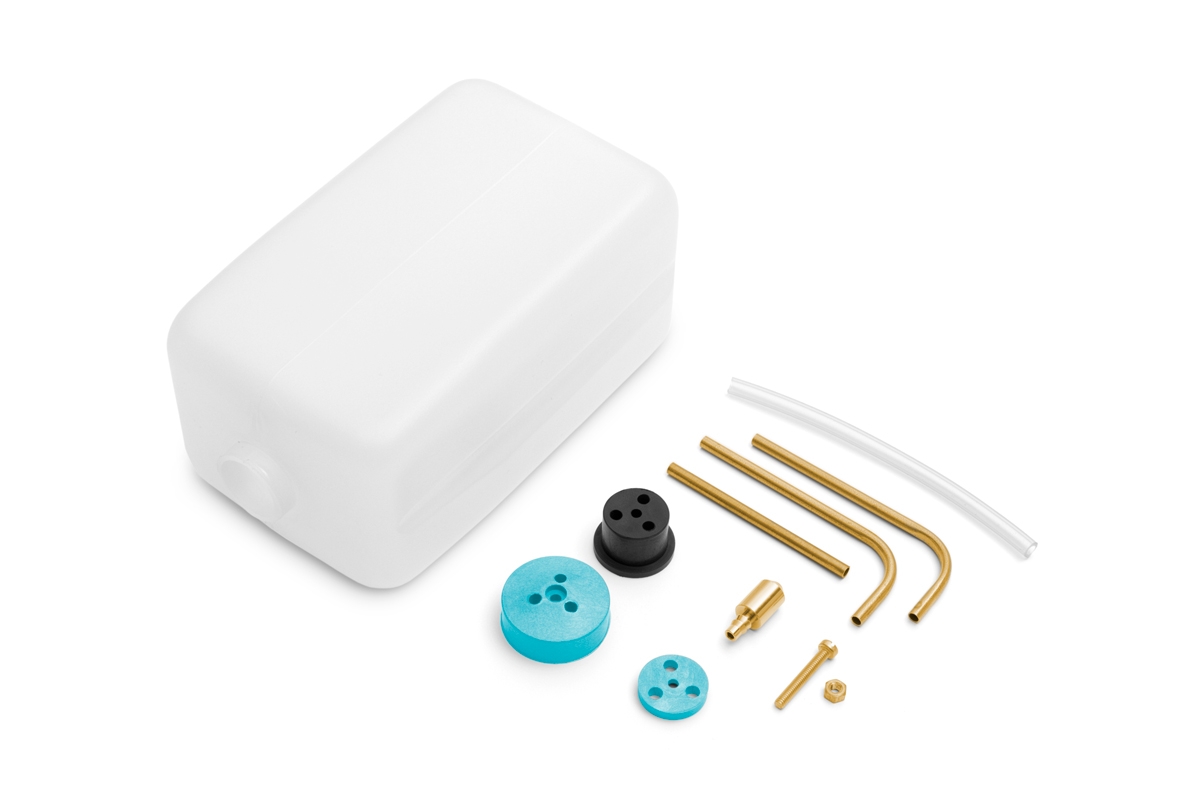 Lehká ale pevná nylonová nádrž 450 ml pro žhavící palivo s odolným víčkem, gumovou zátkou a opěrnou deskou. Předohýbané mosazné fitinky a sací závaží, silikonová hadička. Rozměry (bez hrdla a víčka): 121x75x61 mm, hmotnost: 52g.