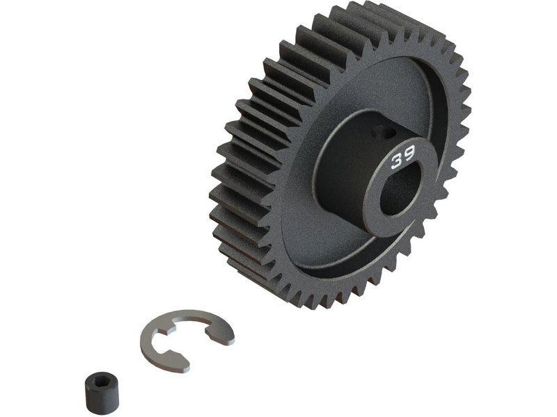 Arrma ocelový pastorek 39 zubů, modul M1, otvor Safe-D8. Otvor ve tvaru 'D' odpovídá profilu hřídele motoru s hřídelí 8mm a drážkou, proto se nemůže pastorek na hřídeli protočit. Stavěcí šroub - M4 x 4mm, segrovka 6mm. Precizně vyrobený široký profil zubu pro hladký chod.