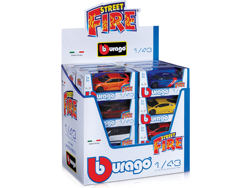 Kovové modely aut 1:43 Bburago jsou uloženy a prodávány v prodejním displeji, který obsahuje celkem 24 modelů autíček. Orientační seznam autíček v sadě - viz. seznam níže: