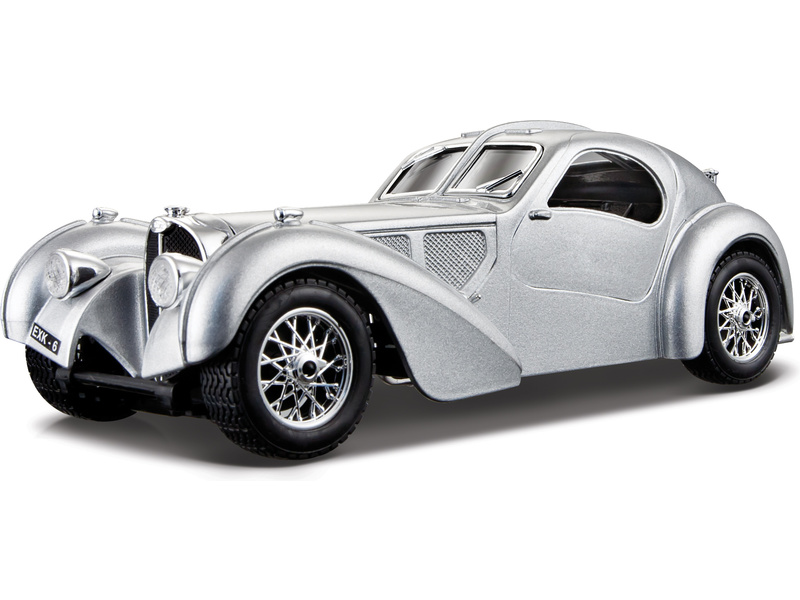 Kovový model auta 1:24 Bburago 18-22092 Bugatti Atlantic nejen pro sběratele. Má otevírací dveře a kapotu, natáčení kol volantem je plně funkční. Barva modelu je stříbrná.