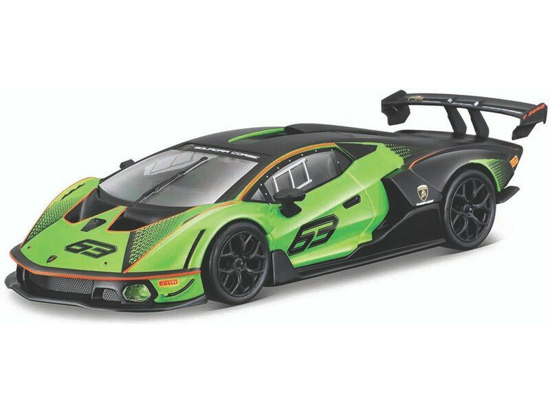 Kovový model auta 1:32 Bburago 18-41161 Lamborghini Essenza SCV12 nejen pro sběratele. Model je asi 13 cm velký a má černou a zelenou barvu se závodním číslem. Model je v detailním provedení, skvělá úroveň zpracování.