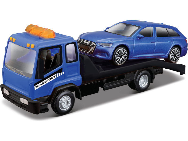 Model Bburago 18-31418 - Odtahovka s modelem auta Audi A6 Avant v měřítku 1:43 je vyrobený z kovových a plastových dílů. Model má pohyblivou nákladovou plochu pro najíždění a sjíždění modelu auta. Barva modelů je modrá metalíza.