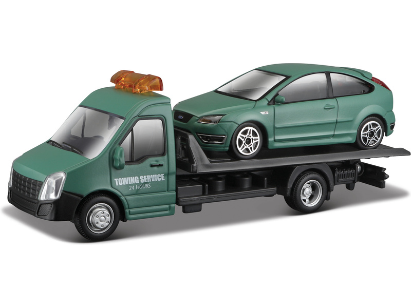 Kovový model Bburago 18-31404 - Odtahovka s modelem auta Ford Focus ST v měřítku 1:43. Je vyroben z kovových a plastových dílů. Model má pohyblivou nákladovou plochu, pryžové pneumatiky, detailní zpracování. Barva modelů je zelená, odtahovka je velká přibližně 17 cm, autíčko je velké přibližně 10 cm.