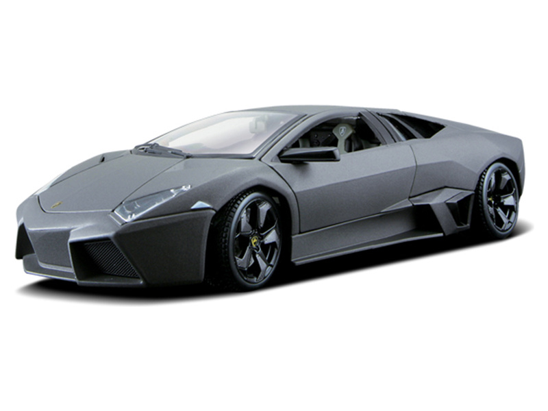 Kovový model auta v měřítku 1:24 Bburago 18-21041 Plus - Lamborghini Reventón v šedé metalíze. Model má otevírací dveře a kapotu, natáčení kol volantem je plně funkční. Auto je přibližně 19 cm velké.