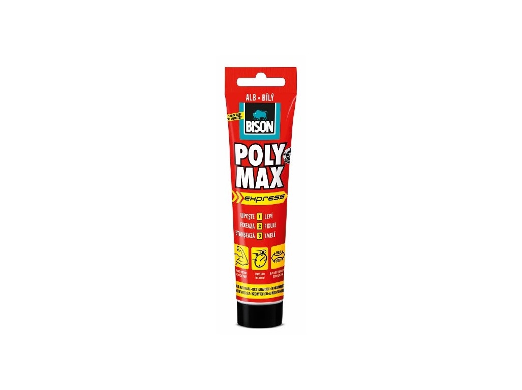 Bison Poly Max Express je rychleschnoucí montážní lepidlo s extrémní konečnou pevností. Manipulační pevnosti dosahuje již po 30 minutách, funkční pevnost již po ca 4 hodinách. Lepený spoj je elastický, absorbuje vibrace, nesmršťuje se a má velké kombinační schopnosti. Lepidlo odolává vlhkosti, povětrnostním vlivům a teplotám od -40°C do +100°C a je přetíratelné. Vydatnost 5 - 8 m2/kg.