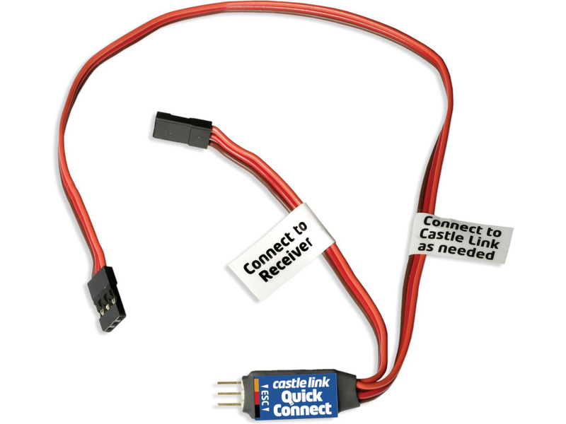Propojka Castle Quick Connect se zapojí mezi regulátor Castle a přijímač a umožní snadné programování pomocí programátorů Castle. Nebude nutné složité vysouvání konektoru regulátoru z přijímače, programátor stačí zapojit do volného vyvedeného konektoru.