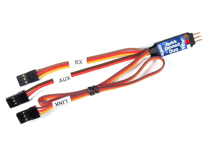 Propojka Castle Quick Connect Duo se zapojí mezi regulátor Castle a přijímač a umožní snadné programování pomocí programátorů Castle. Nebude nutné složité vysouvání konektoru regulátoru z přijímače, programátor stačí zapojit do volného vyvedeného konektoru.