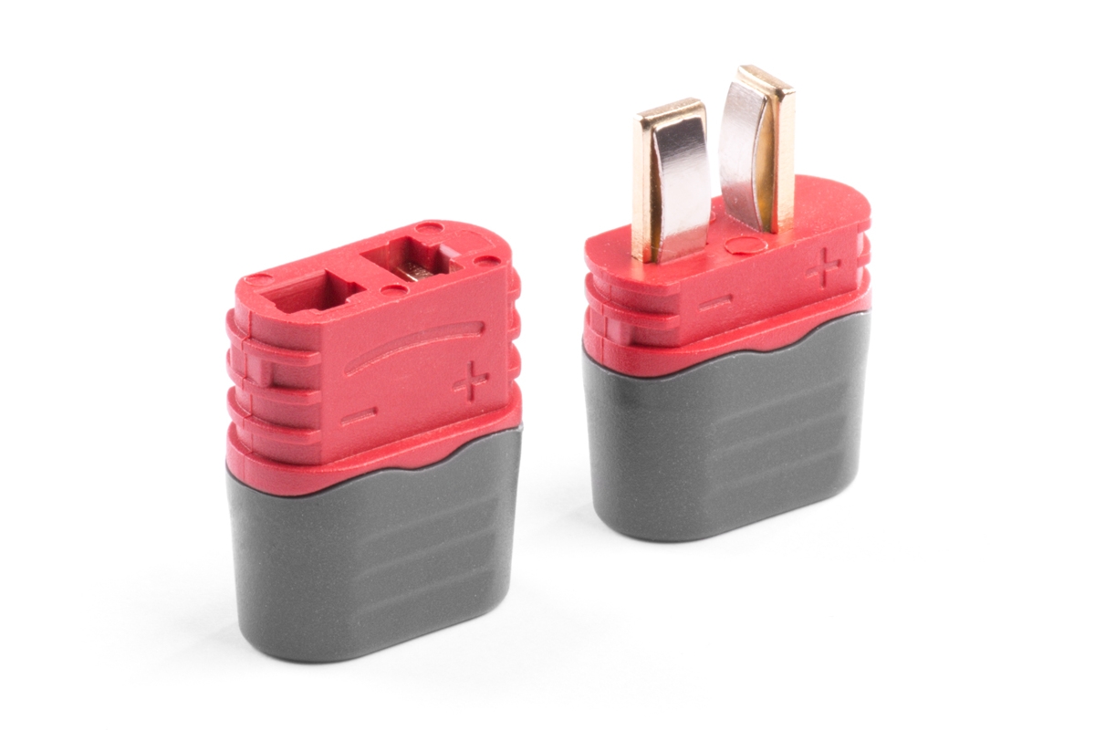 Dvoukolíkový silový konektor s plochými zlacenými kontakty se zatížitelností max. 50 A (dlohodobě 25A) se zaobleným drážkovaným tělem pro pevnější uchopení a kryty kabelů. Pro kabely o průřezu max. 3,3 mm2 (12AWG). Přechodový odpor 0,45 mOhm, max. 500 V. Balení 1 pár s kryty kabelů.