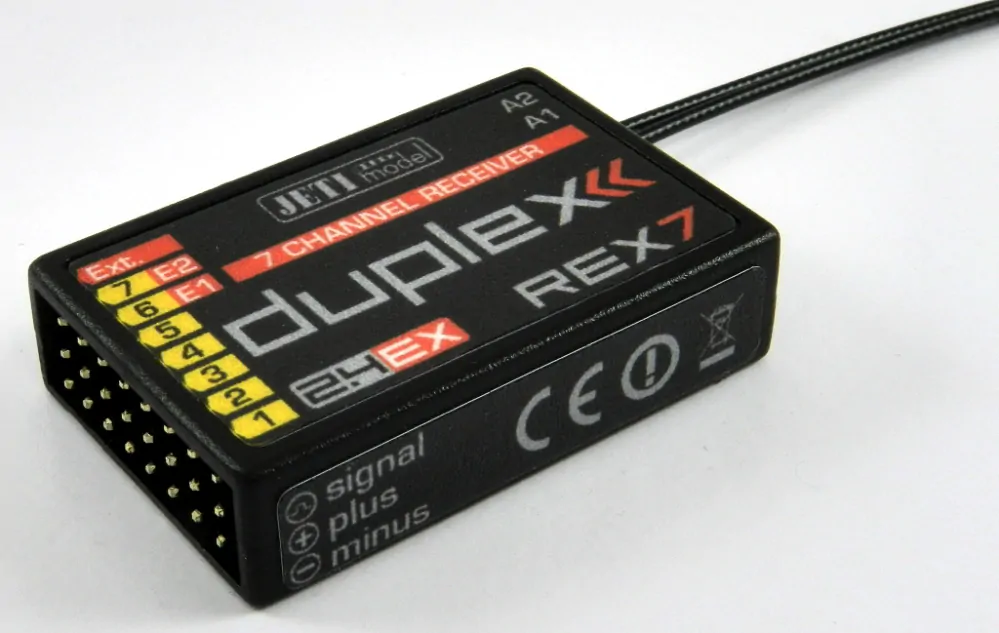 7-mi kanálový přijímač kompatibilní s protokoly JETI EX & EX Bus. Podporuje telemetrické funkce. Dva uživatelsky nastavitelné výstupy E1 a E2 s možnostmi nastavení pro servo, JETIBOX/Senzor EX, PPM výstup, PPM vstup, EX Bus výstup, UDI výstup, S.BUS. Možnost přímého připojení až tří telemetrických senzorů.