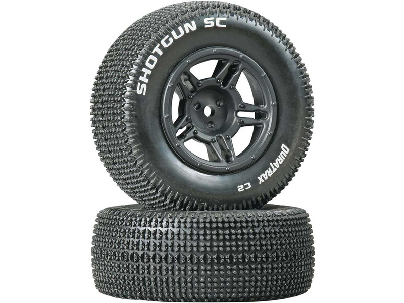 Kompletní kola Duratrax Shotgun SC pro RC modely aut. Disk má černou barvu, tvrdost směsi pneumatiky je C2 - měkká směs.