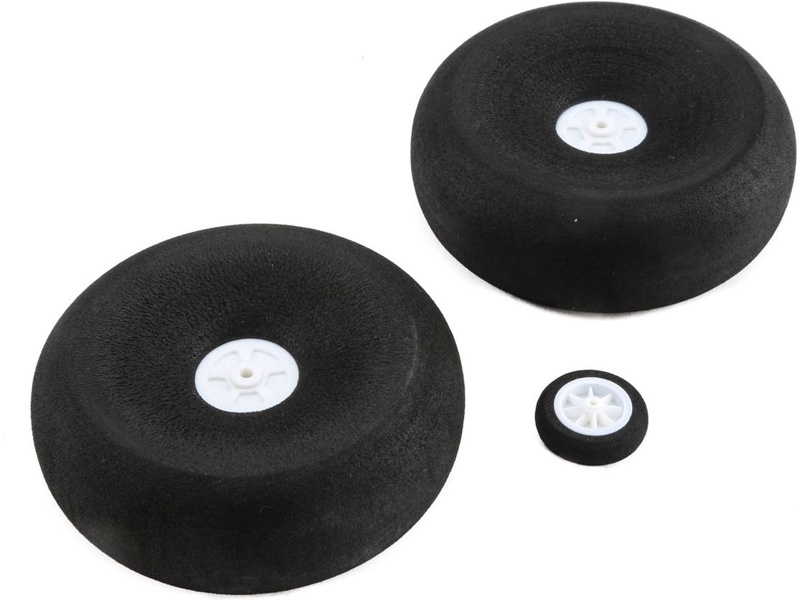Sada kol pro RC model letadla Timber. Kola jsou lehká pěnová, průměr 108mm, šířka 38mm, otvor 3mm. Ostruhové kolečko má průměr 28mm, otvor 2mm.