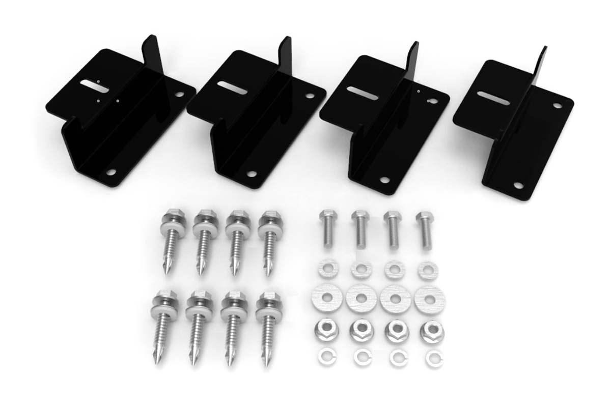 Obsah balení: 4x "Z" držák, 4x M6 podložka, 4x M6 pérová podložka, 4x M6 přírubová matice, 4x M6-16 šestihranný šroub, 4x M6 plochá podložka, 8x samořezný šroub s plastovým pojistným kroužkem. Pro uchycení 100W panelu je potřeba 1 sada, pro uchycení 400W panelu jsou potřeba 2 sady.