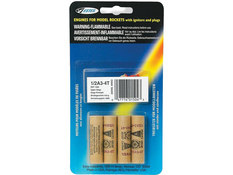 Sada 4 raketových motorů Estes 1/2A3-4T do modelů raket včetně elektrických palníků.