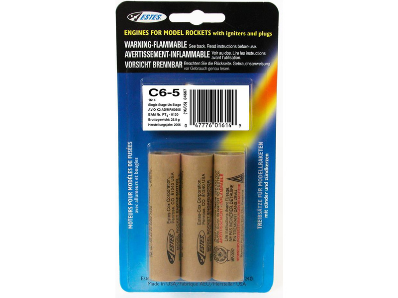Sada 3 raketových motorů Estes C6-5 do modelů raket včetně elektrických palníků. Prodej pouze osobám starších 18 let! Kategorie P1. Nakoupením produktu potvrzujete, že splňujete uvedené věkové hranice (při předávání zboží bude věk kontrolován přepravcem).