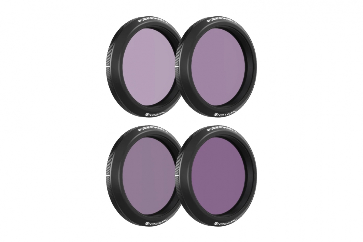 Sada čtyř filtrů Freewell pro akční kameru DJI Osmo Action 5 Pro. Sada obsahuje filtry ND8/PL, ND16/PL, ND32/PL, ND64/PL. Kompatibilní s Osmo Action 4 a Osmo Action 3.