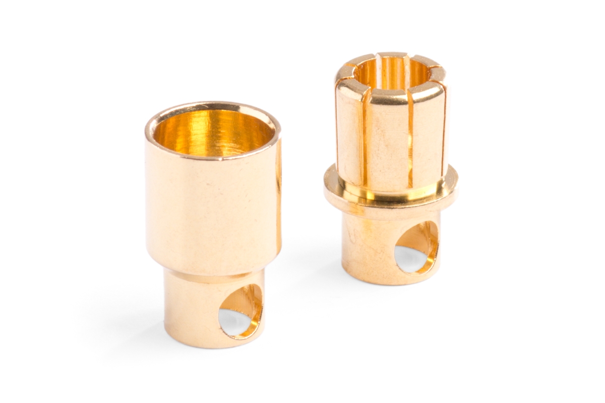 Robustní silový zlacený konektor 8 mm se segmentovým pružným kolíčkem se zatížitelností max. 170A (dlouhodobě 80A). Pro kabely o průřezu max. 13,3 mm2 (6AWG). Přechodový odpor 0,15 mOhm, max. 500 V. Balení 1 pár kolíček/dutinka.