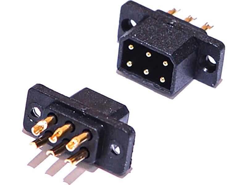 6pinový polarizovaný konektor zajišťující správné připojení s montážními přírubami, pro snadnou montáž a odolnými kontakty. Vhodné například k připojení serv, osvětlení apod. na demontovatelném křídle. Balení obsahuej 2 páry (celkem 4 kusy).