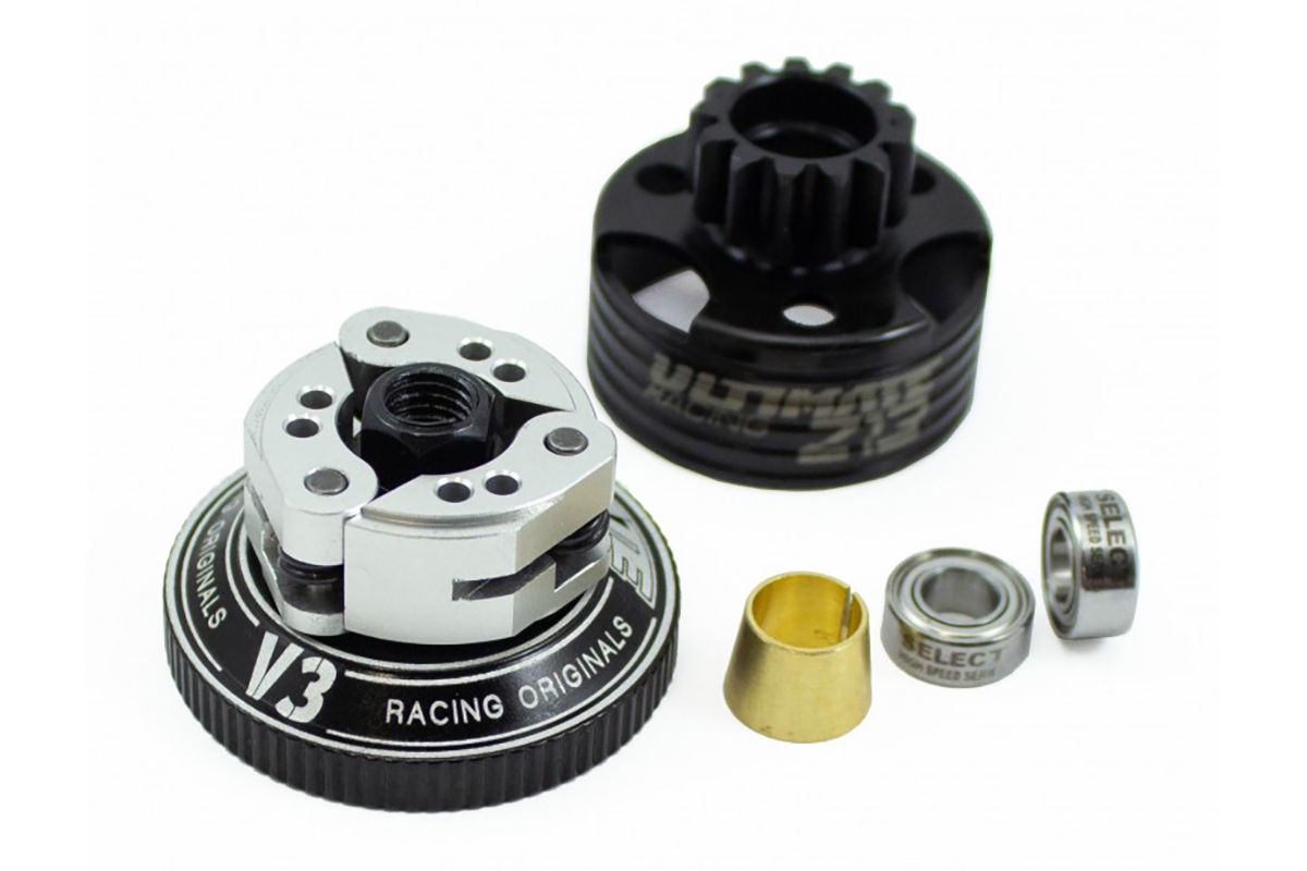 Jedná se o sadu hliníkového spojkového systému Ultimate Racing Compak V3 B11 a spojkového zvonečku Venitlated Z13 s ložisky.