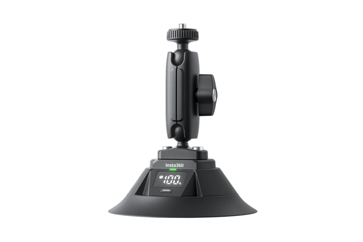 Elektrický přísavný držák Insta360 umožňuje pevné a bezpečné uchycení kamery na hladké povrchy, jako je sklo nebo karoserie. Díky aktivnímu podtlaku zajišťuje stabilní záběry i při pohybu a je ideální pro natáčení z auta i dalších dynamických scén.