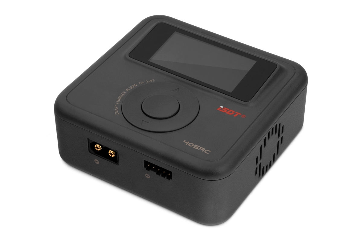 Miniaturní nabíječ ISDT 405AC 60W je inteligentní nabíječ s napájením ze sítě a velmi jednoduchou a přehlednou obsluhou. 405AC umožňuje nabíjet a vybíjet běžné typy článků (NiMH, LiPo, LiHV/ULiHV, LiFe, Li-ion, Pb), navíc je vybaven vestavěným čtyřkanálovým balancerem, který zajišťuje bezpečné nabíjení lithiových akumulátorů. Nabíječ je vybaven barevným LCD displejem a třemi programovacími tlačítky, které vám poskytnou možnost komfortního a přehledného nastavování parametrů, řízení a sledování průběhu nabíjení.