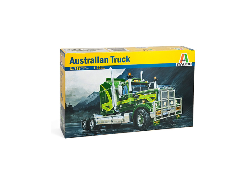 Plastikový model Italeri 0719 - trucku Australský kamión v měřítku 1:24 ke slepení. Délka modelu 332 mm, obtížnost 4. Balení obsahuje SUPER OBTISKY.
