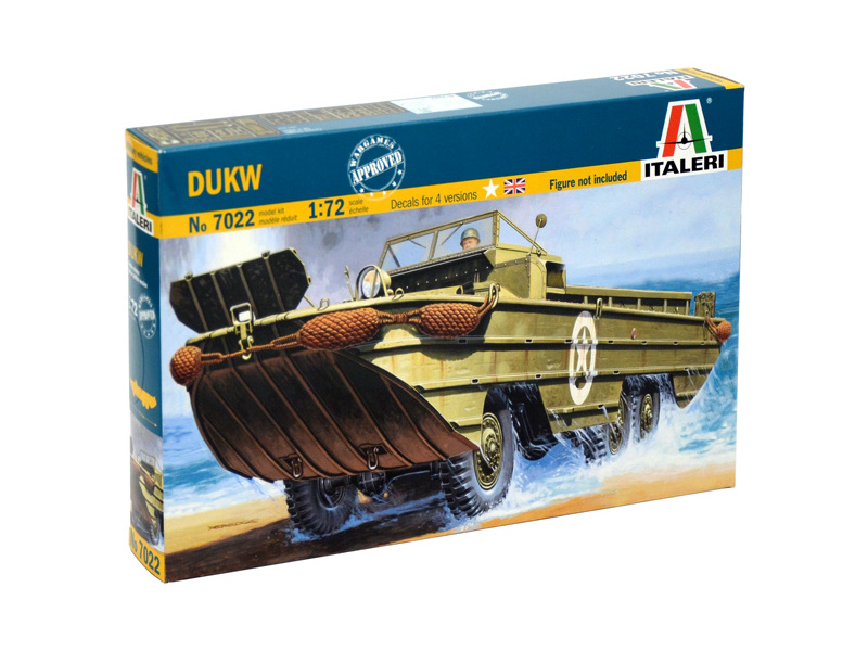 Plastikový model Italeri 7022 - military GMC DUKW v měřítku 1:72 ke slepení. Obtížnost 2. Balení obsahuje SKVĚLÉ OBTISKY PRO 4 VERZE.