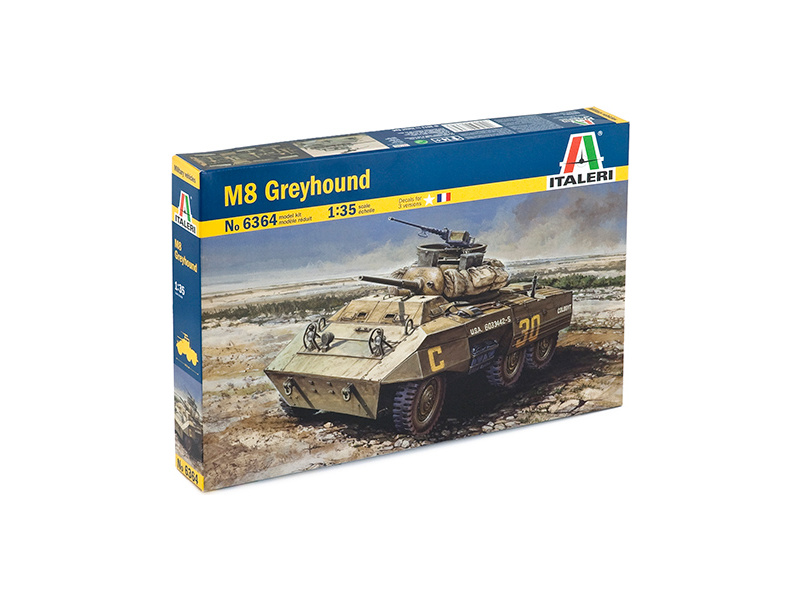 Plastikový model Italeri 6364 - tank M-8 Greyhound v měřítku 1:35 ke slepení. Obtížnost 3. Balení obsahuje SKVĚLÉ OBTISKY PRO 4 VERZE.