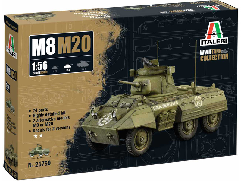 Italeri plastikový model amerického obrněného vozidla M8/M20 v měřítku 1:56 ke slepení. Délka 84 mm, 74 dílků, stavební obtížnost 1. Balení obsahuje 2 verze obtisků: