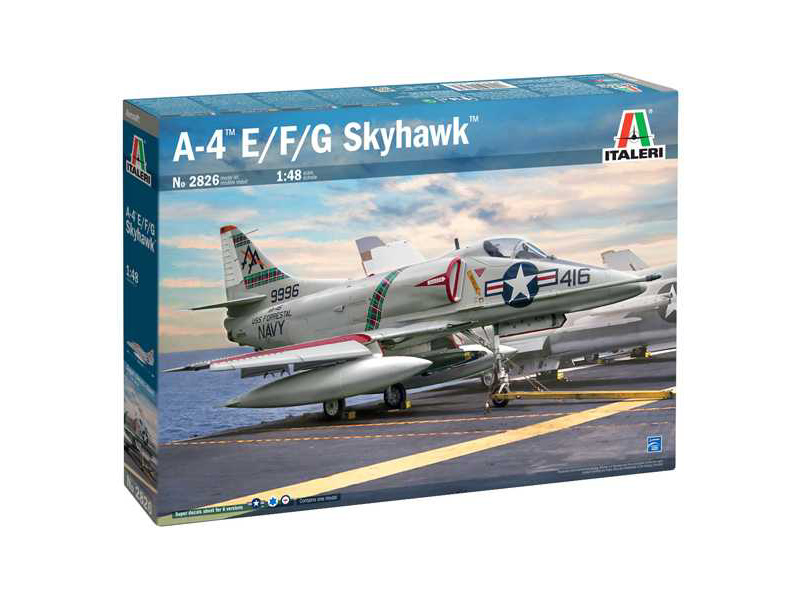 Plastikový model Italeri 2826 - letadlo McDonnell A-4 E/F/G Skyhawk v měřítku 1:48 ke slepení. Délka modelu 265 mm, obtížnost 3. Balení obsahuje SKVĚLÉ OBTISKY PRO 6 VERZÍ.