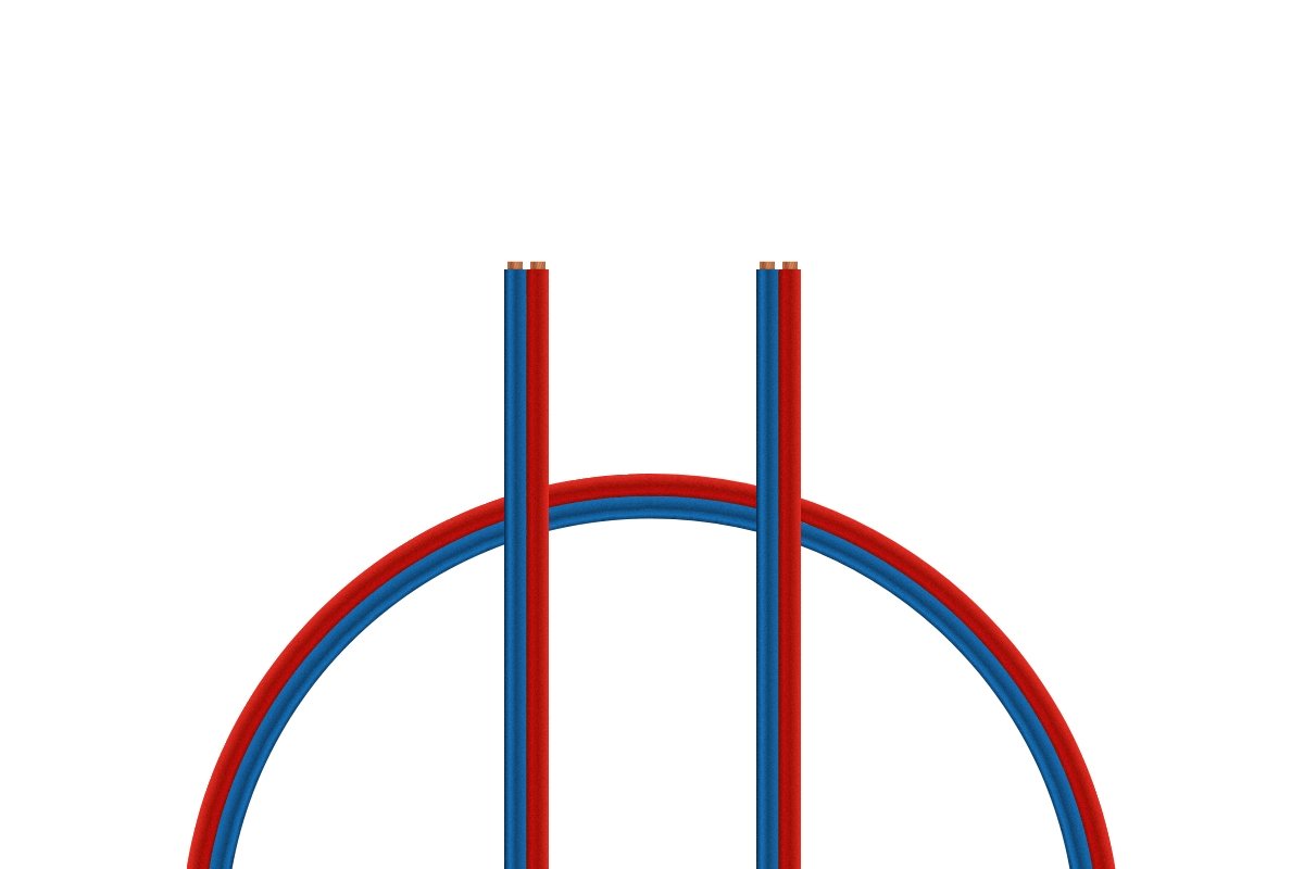 Ohebný napájecí dvoužilový kabel 2x 0,35 mm2 s PVC izolací v barvě červené a modré. Max. 48 V, 5 A. Vyrobeno v Německu.