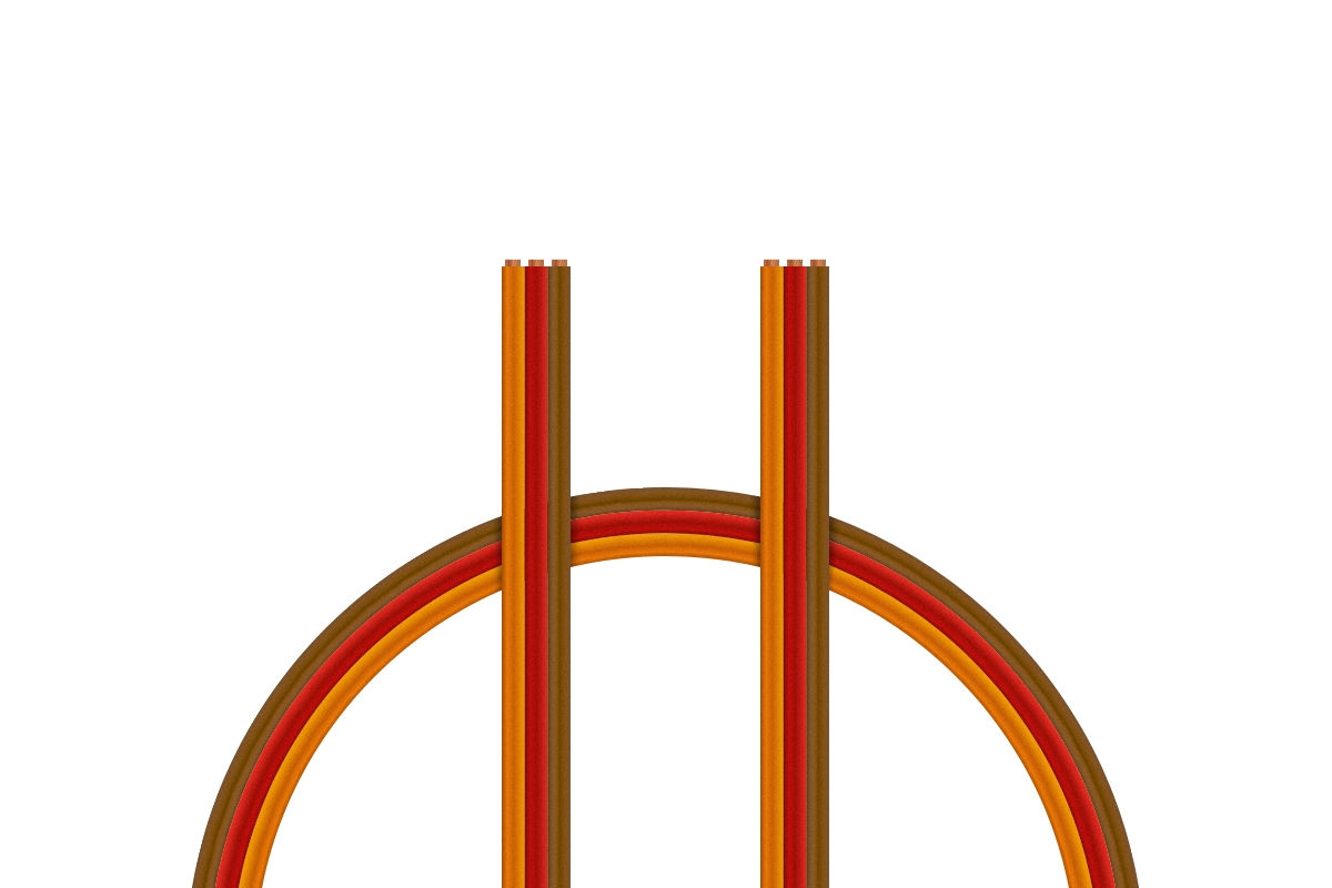 Plochý třížilový kabel tlustý v barvách JR (hnědá/červená/oranžová) s PVC izolací, průřez vodičů 0,25 mm2. Vysoce ohebný, lanka ze 65 pramenů 0,07 mm, vnější rozměr 1,5x4,8 mm, max. 48 V, 5A. Vyrobeno v Německu. Cena za 1 meter