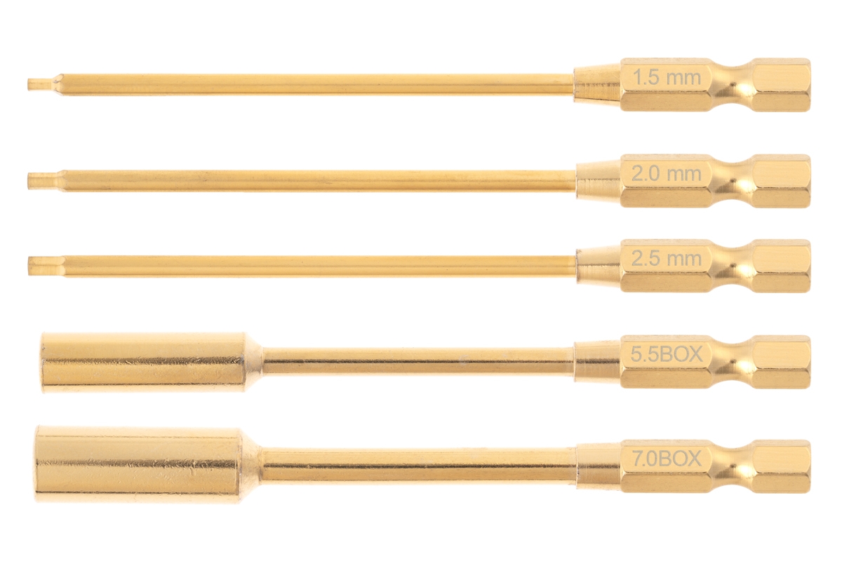 Sada 5 bitů pro elektrické šroubováky, vyrobených z tvrdé oceli s titanovou povrchovou úpravou. Součástí je 1,5mm, 2,0mm, 2,5mm, 5,5mm a 7,0mm bit pro 6,35mm šestihranný adaptér.