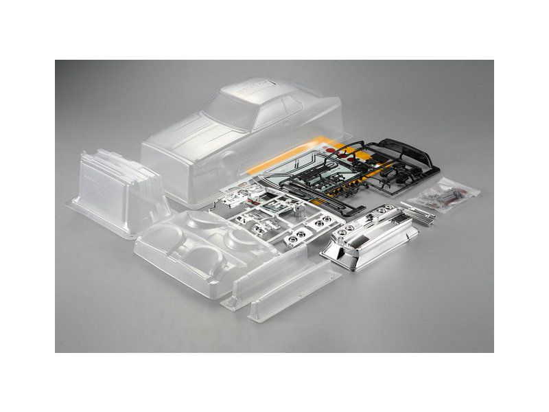 Obsahem balení je čirá karoserie 1:10 Nissan Skyline 2000 Turbo GT-ES C211, bohaté příslušenství - masky oken, nálepky, chromové díly ( držáky světel a mlhovek, výfuk, kliky dveří, víčko nádrže ), černé plastové díly ( přední spoiler, zpětné a postranní zrcátka, stěrače, SPZ, mřížka chladiče a další ), nárazníky, lemy blatníků a ostatní příslušenství ( sada šroubků, oboustranná lepící páska, arch samolepek ... ), obrázkový návod.