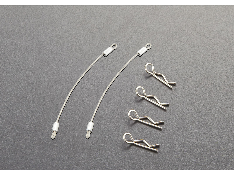 Killerbody Vám nabízí karosářské sponky s ocelovým lankem pro RC modely aut. Obsahem balení jsou 4 x malá sponka na karoserii, 2 x ocelové lanko délky 80 mm.