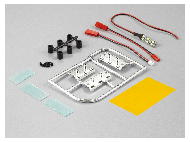 Obsahem balení je 3 x chromový rámeček v různých velikostech, 3 x čirý lexan 1 mm, pás s 6 LED diodami 27 x 8 mm - kabel 42 cm dlouhý, redukce k řídící jednotce 15 cm, samolepka pro nalepení SPZ, montážní příslušenství, obrázkový návod.