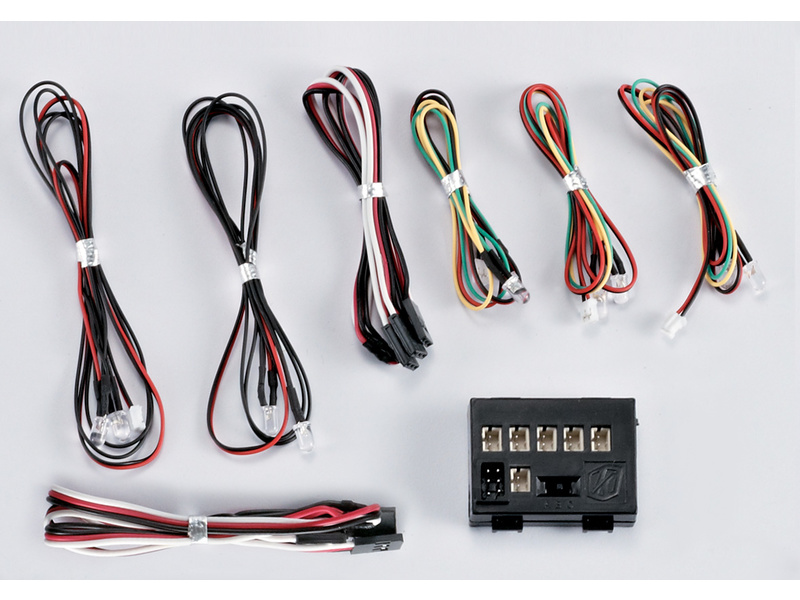 Balení obsahuje: řídící jednotku, 2 x 2 oranžové LED diody, 1 x 2 modré LED diody, 1 x 2 červené, LED diody, 1 x 2 bílé LED diody, 2 x Y-kabely - Rx/servo, Rx/regulátor. Originální a český návod.