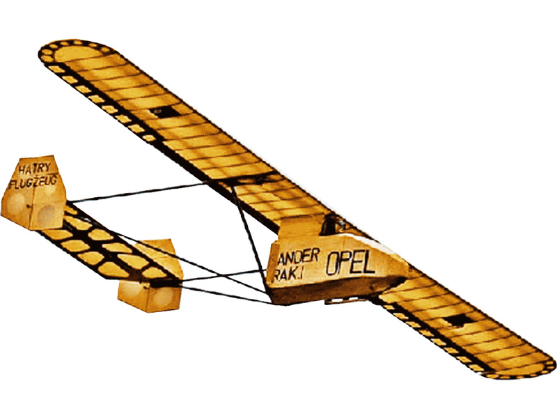 Stavebnice RC modelu raketového letadla Opel Sander RAK 1 Kit. Skutečné letadlo bylo navrženo a postaveno Juliusem Hatrym na objednávku Fritze von Opela, který s ním letěl 30. září 1929 před diváky na letišti Rebstock poblíž Frankfurtu nad Mohanem. RC model od Klima o rozpětí 1900mm využívá k pohonu 4 až 8 raketových motorů D3-P. Po vyhoření motorů je model ovládán jako kluzák pomocí RC soupravy. Elektronika ani raketové motory nejsou součástí balení.