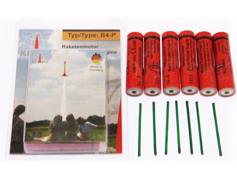 Raketový motor Klima B4-P pro modely raket. Obsahem balení je 6 raketových motorků B4-P včetně zápalnic. Rozměr ø18 x 70 mm, impuls 4,9N·s, tah cca 4,5N, doba hoření 1,2s, bez výmetu, pro modely do 90 g. Kategorie P1, prodej osobám starších 18 let!