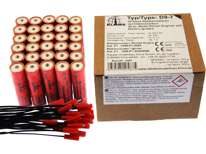 Obsahem balení je 30 raketových motorků Klima D9-7 včetně el. palníků, návod k použití.