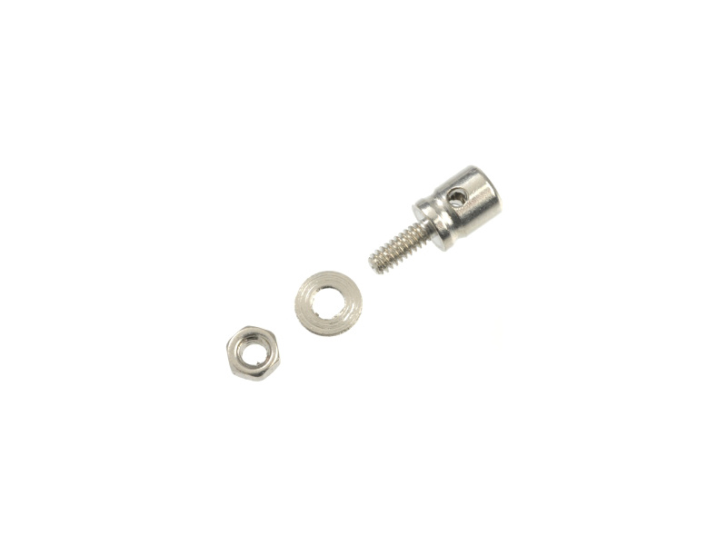 Konektor táhla stavitelný mikro (5 ks). Průměr 3,5mm, délka 8,5mm, závit M1,5, otvor v těle prům. 1,5mm. Pojistný šroub M2. K páce táhla se připevní na závit s maticí, ocelový drát táhla se nasune do otvoru v těle konektoru a pojistí se šroubem.