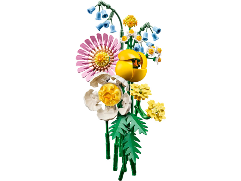 - Květiny LEGO® – Kytice se skládá z 7 druhů jarních květin v pastelových odstínech, včetně kraspédie, zvonků, kapradin, žlutého řebříčku, gerbery, pivoňky a tulipánu