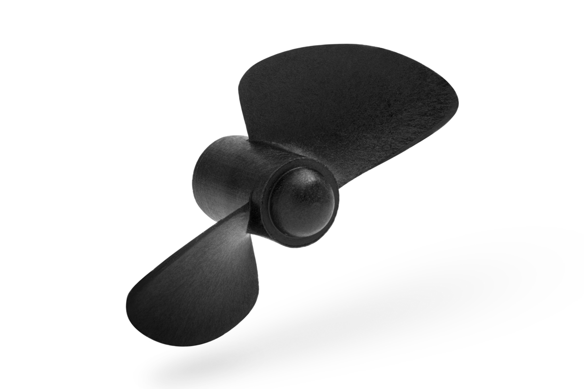 Dvoulistý levotočivý lodní šroub 45mm pro montáž pod loď, stoupání 15 stupňů, plast plněný skelnými vlákny, závit M4.